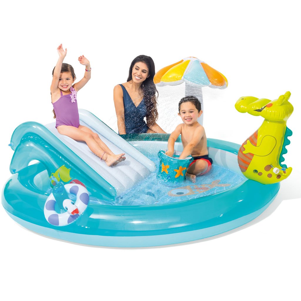 Hrací centrum INTEX s krokodýlem je zábavné bazénové hrací centrum se skluzavkou, vodní sprchou (připojení na zahradní hadici), dětským brouzdalištěm a dalšími doplňky.