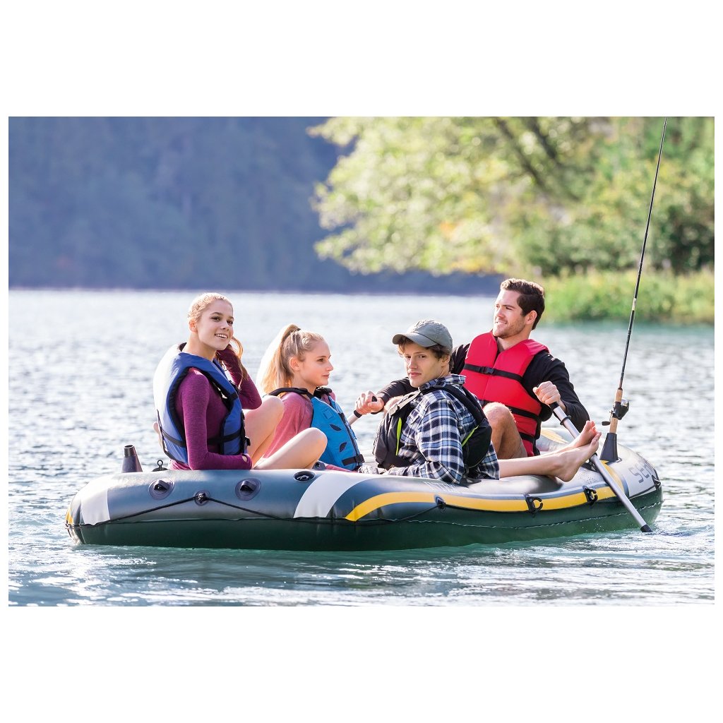 Nafukovací člun INTEX Seahawk 4 Set poskytuje dostatek místa a pohodlí 4 osobám. Je vhodný pro rekreační použití zejména k rybolovu na rybnících, přehradách, či na klidných řekách. Člun má SUPER-TOUGH konstrukci z vysokomolekulárního PVC, které je netečné vůči benzínu, oleji a slané vodě. Tento materiál je velmi odolný proti otěru, nárazu a slunečnímu záření. Také vydrží vyšší plnící tlak, což zvyšuje pevnost člunu.