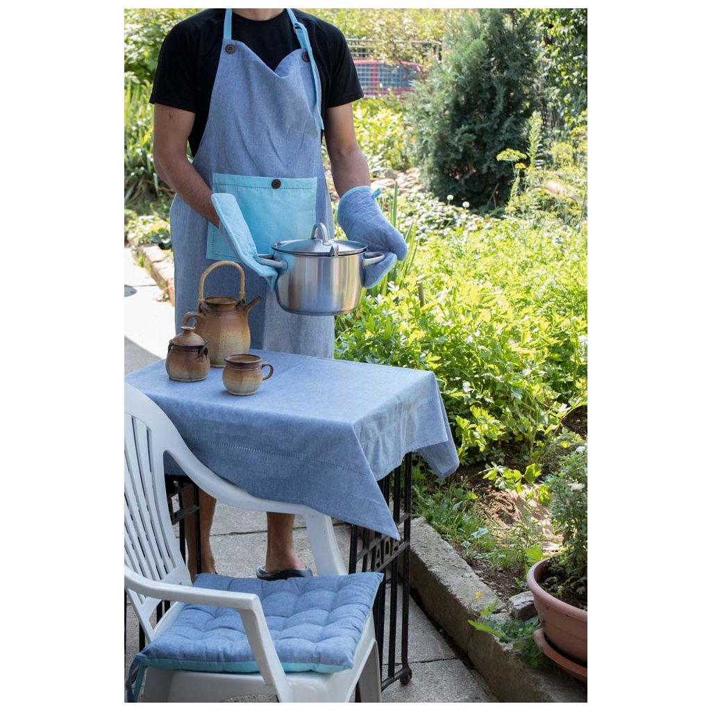 Kuchyňská zástěra z recyklované bavlny v přírodním odstínu barvy světle modré a tmavě modré je ozdobená praktickou kapsičkou, ozdobným štepováním, lemem a hnědými kokosovými knoflíky. Světle modré šňůrky kolem krku lze nastavit i na větší velikost pro muže pomocí provlékací spony.