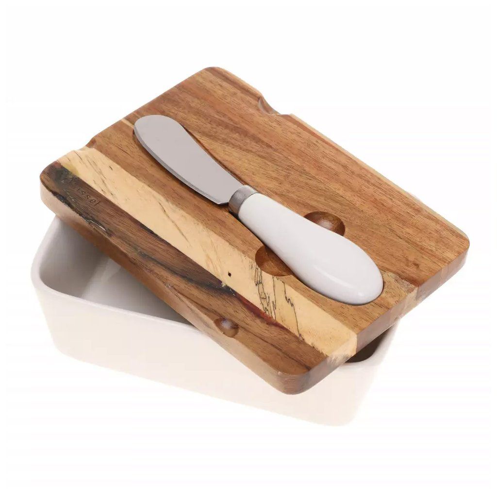 Uchovávejte máslo ale i sýr elegantně a hygienicky s designovou máslenkou Klausberg. Tato stylová dóza je vyrobena z kvalitní keramiky a opatřena víkem z přírodního akáciového dřeva, které pomáhá zachovat čerstvost vašich potravin. Součástí sady je i máslový nožík, díky kterému bude každé servírování potěšením.