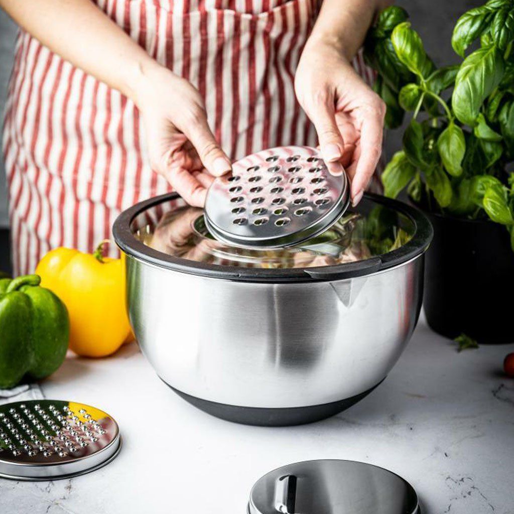 Vysoce kvalitní mísa z nerezové oceli je ideální pro strouhání, míchání, skladování i servírování. Díky chytrému víku, třem výměnným nástavcům a praktickému provedení oceníte tento kousek nejen při každodenním vaření, ale i při pečení. Pro snadnou manipulaci má mísa úchyt se soft touch povrchem a je opatřena výlevkou.