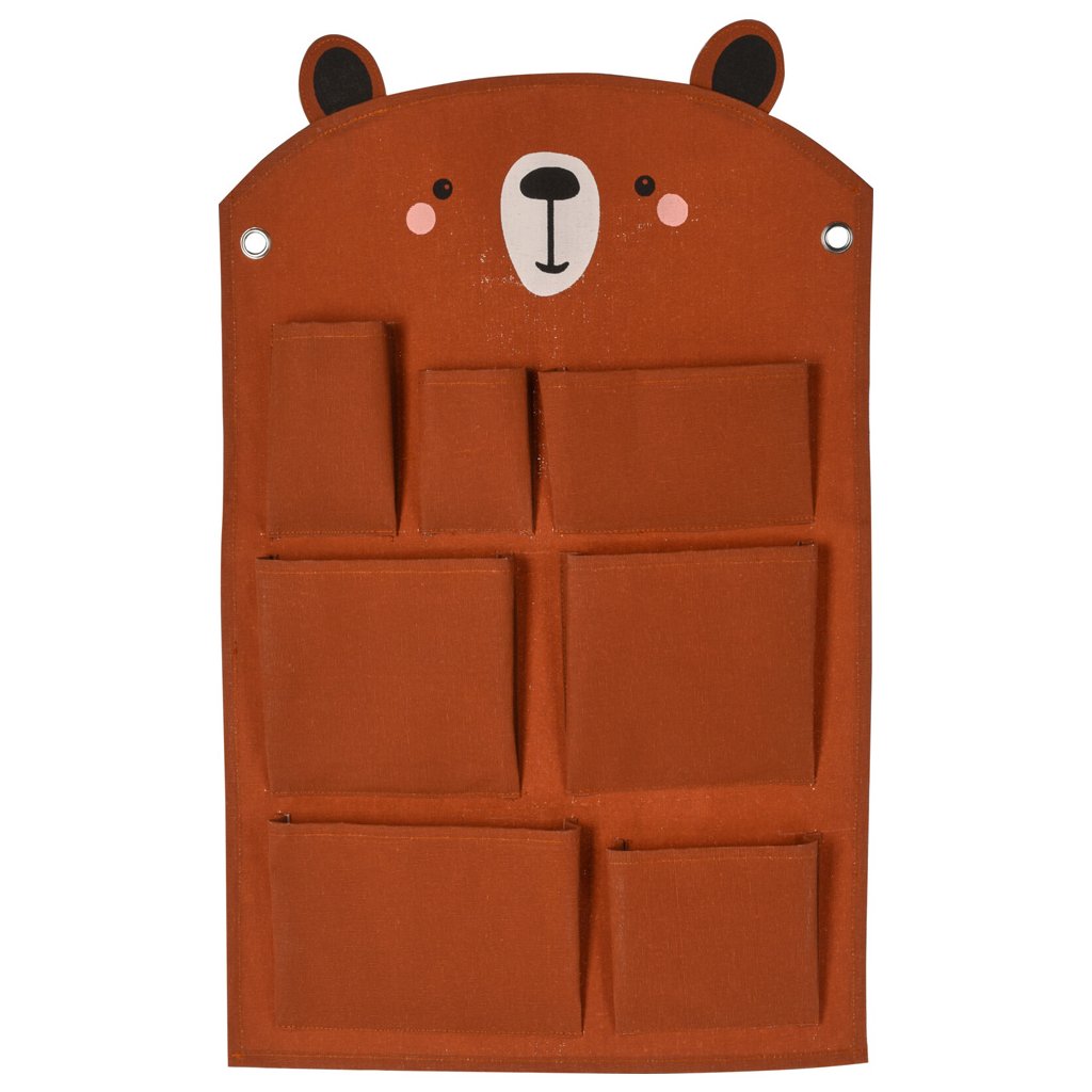 Organizér je vyroben z odolného plátna s motivem medvěda. Má dvě pevná očka, které umožňují zavěšení. Můžete využít také jako úložný prostor zavěšením na postýlku, nebo v autě.