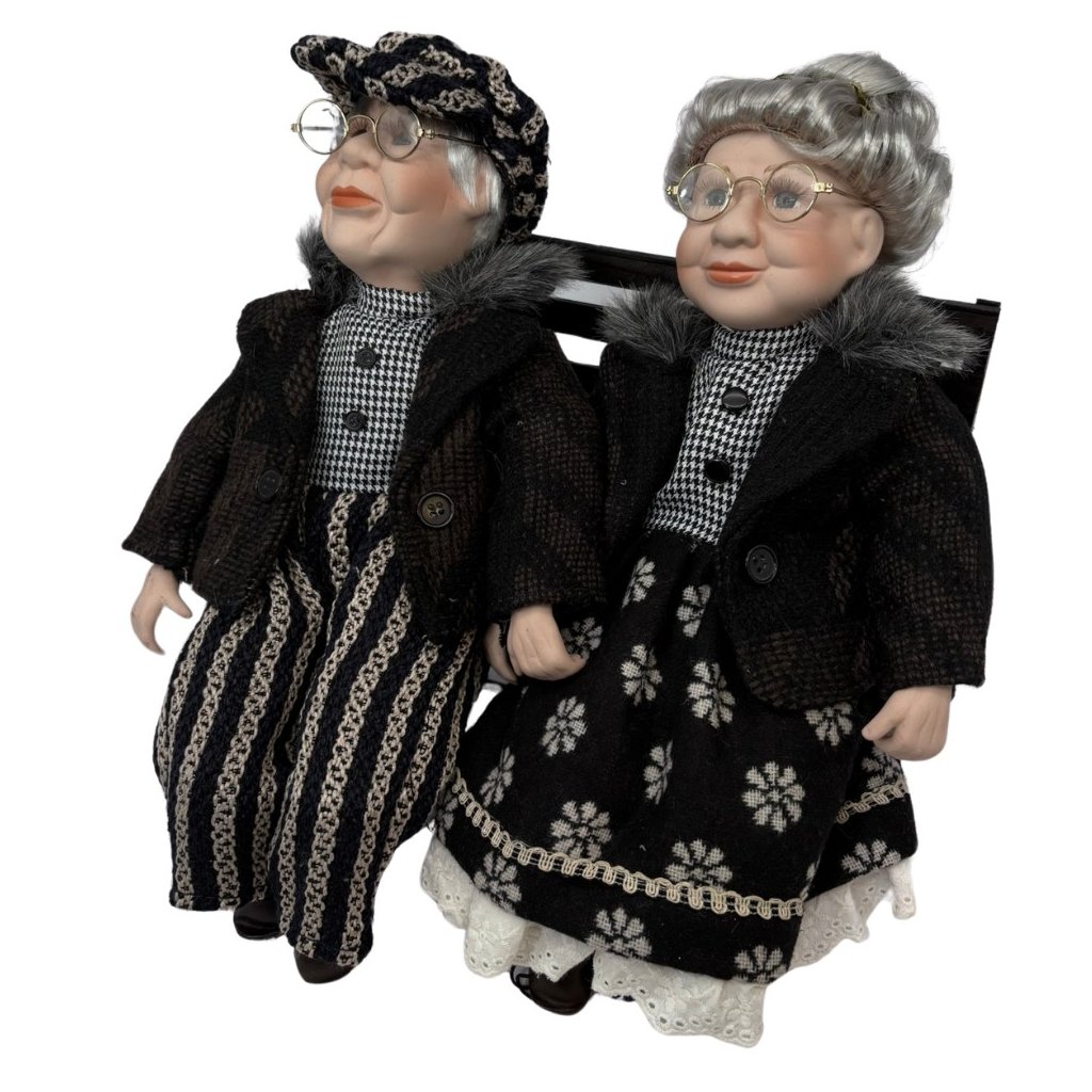 Porcelánové panenky představují prarodiče sedící společně na lavičce. Panenky jsou precizně propracovány do detailů. Nechybí knoflíky na pletených šatech, ale i brýle se zlatou obroučkou.