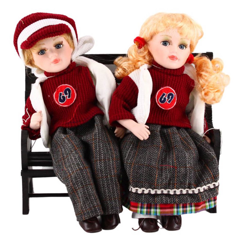 Dekorativní porcelánové panenky představují 2 děti odpočívající na lavičce. Panenky mají stejně laděné stylové oblečení a číslo 69 na hrudi. Oblečení je precizně propracované do detailů, nechybí kšiltovka, blond vlnité vlásky svázané do culíků i tkaničky u obuvi.