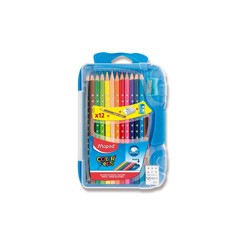 Souprava 12 kusů pastelek Color´Peps s doplňky v boxu, který je extrémně odolný proti rozbití. Ergonomické pastelky Maped ColorPeps mají trojhranné tělo, měkkou odolnou tuhu a jasné barvy.