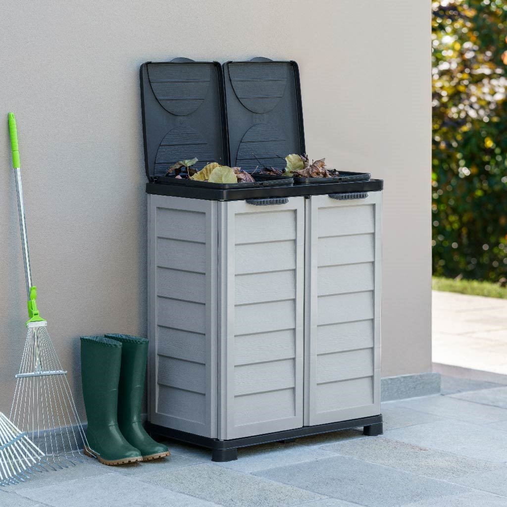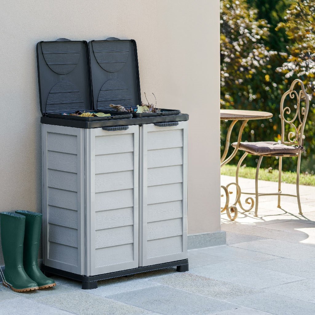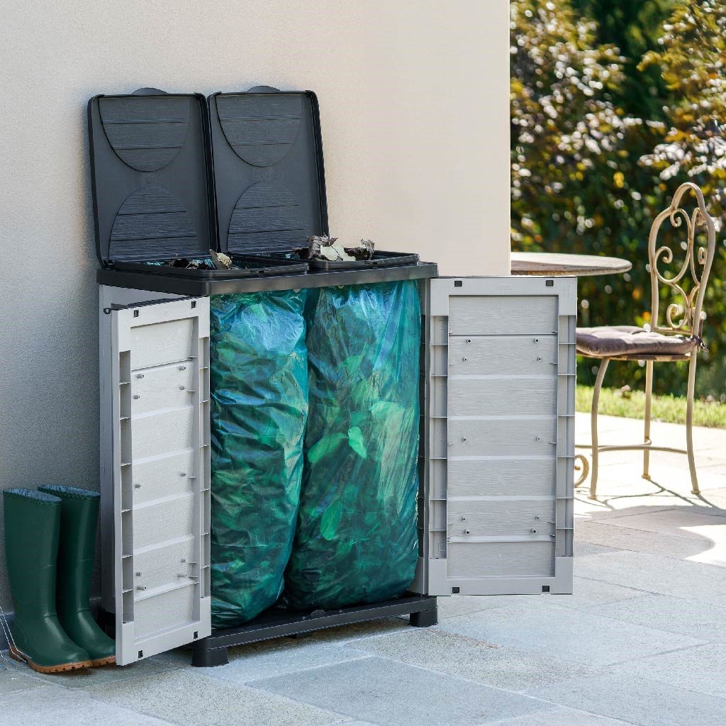 Skříň na odpadkové pytle představuje praktické a elegantní řešení pro diskrétní sběr odpadu. Díky dvěma samostatným přihrádkám s víky a integrovanými držáky na pytle umožňuje pohodlně uložit dva 100litrové pytle. Odpad tak zůstává skrytý a prostor působí čistě a upraveně.