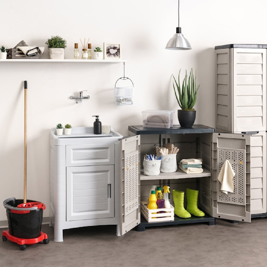 Skříň je vyrobena vstřikováním z polypropylenu. Použité pryskyřice obsahují podíl regenerovaných materiálů z prvotřídních granulí, což zajišťuje vysokou kvalitu, dlouhou životnost a udržitelnost bez kompromisů na odolnosti.