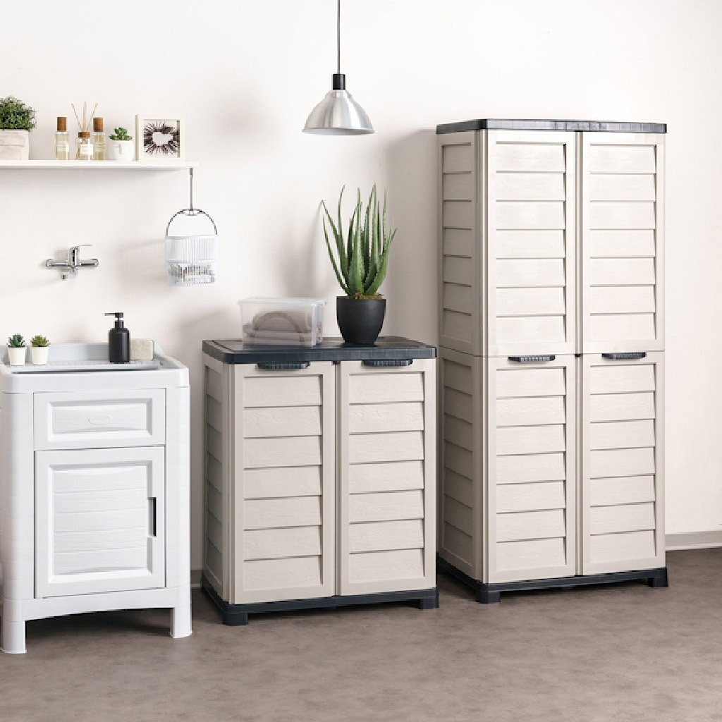 Design s efektem dřeva dodává skříňce elegantní a nadčasový vzhled, který se hodí do moderního i klasického prostředí. Skříňka je vyrobena ze 100% recyklovatelné pryskyřice, která je odolná vůči vlhkosti, nárazům, UV záření i teplotním změnám.