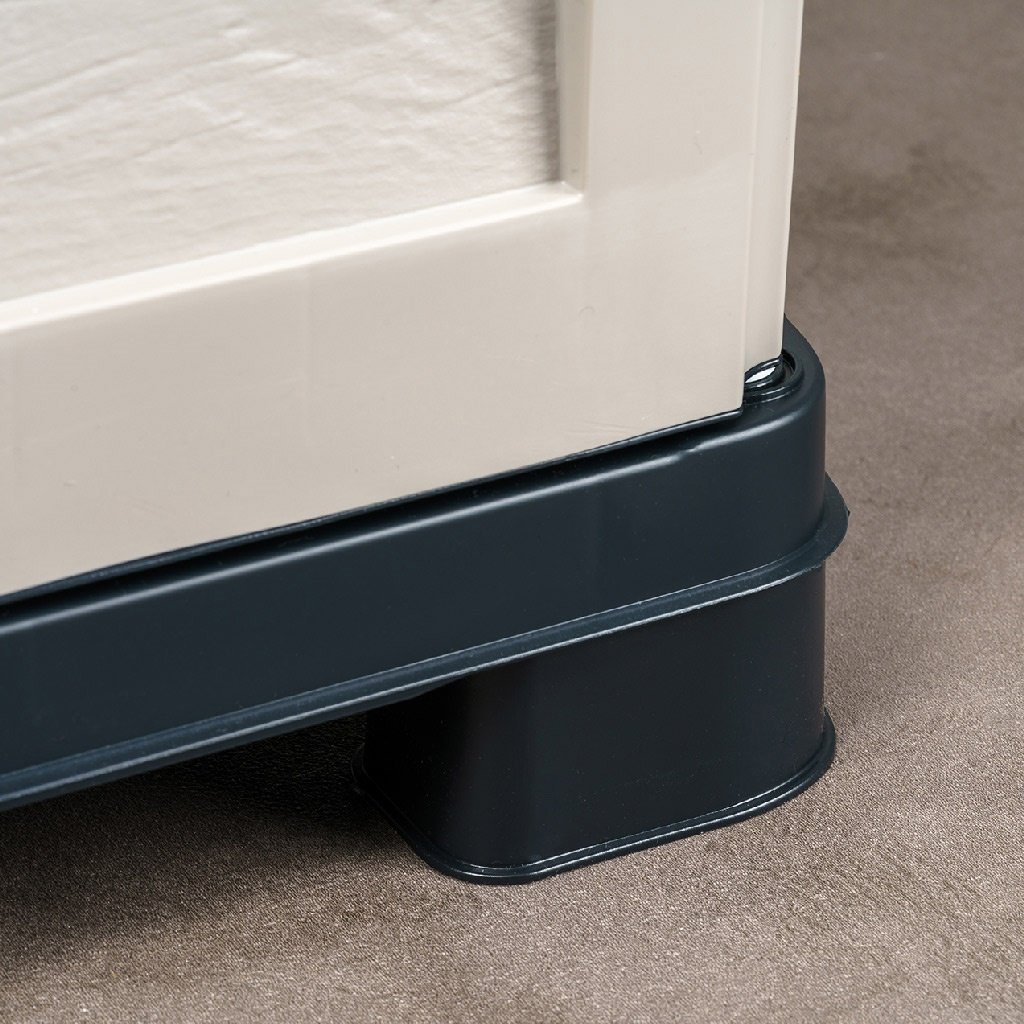 Uvnitř se nacházejí nastavitelné police s nosností až 20 kg, které umožňují přizpůsobit vnitřní prostor podle aktuálních potřeb. Dvířka jsou opatřena vodorovnými úchyty pro pohodlné otevírání a lze je uzamknout visacím zámkem (není součástí balení). Montáž skříňky je rychlá a jednoduchá, bez použití nářadí.