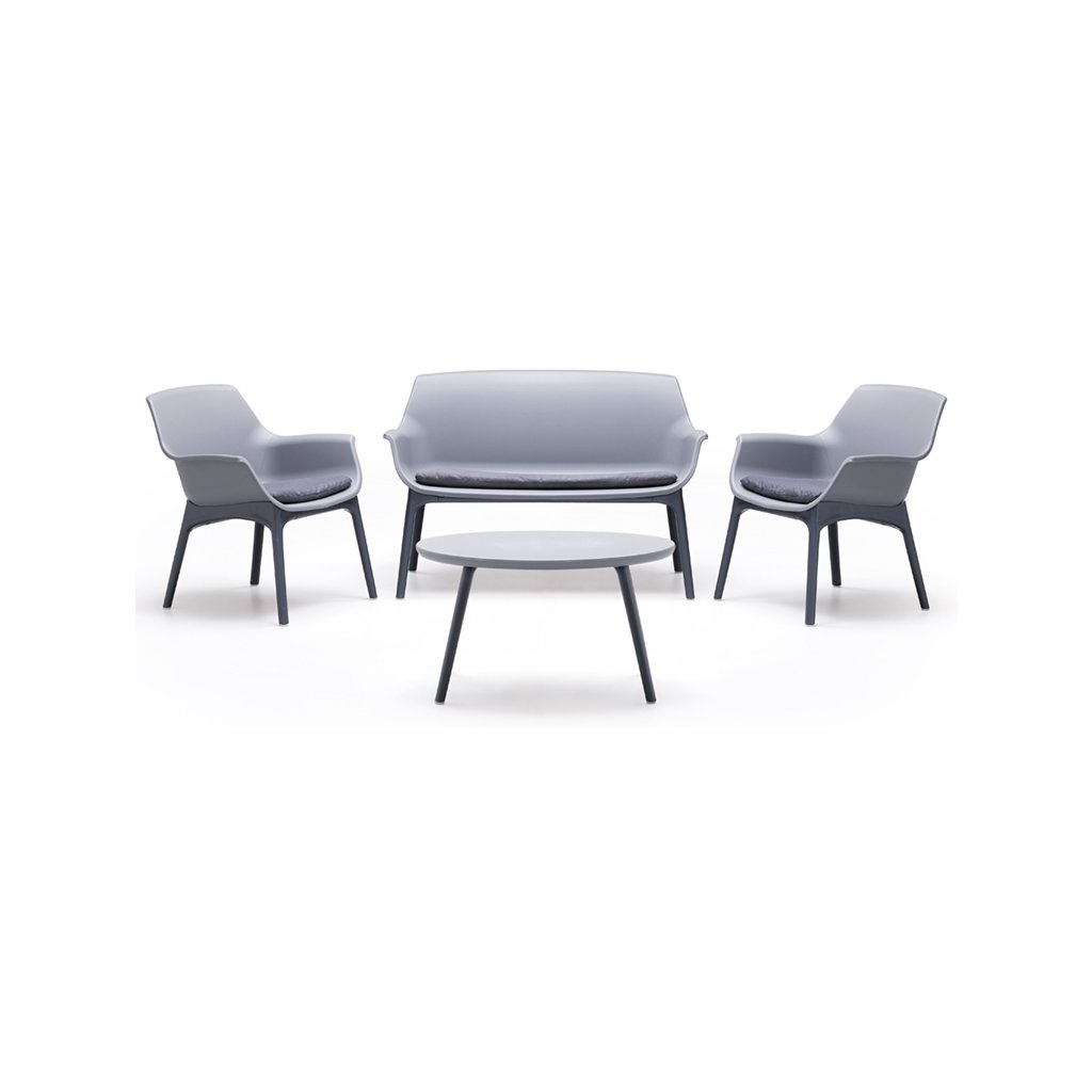 BICA souprava plastového nábytku LUXOR pro příjemné posezení, čtyřdílná, kombinace barev světle a tmavě šedé. Vrchní část je světle šedá. Spodní část i podsedáky jsou tmavě šedé.