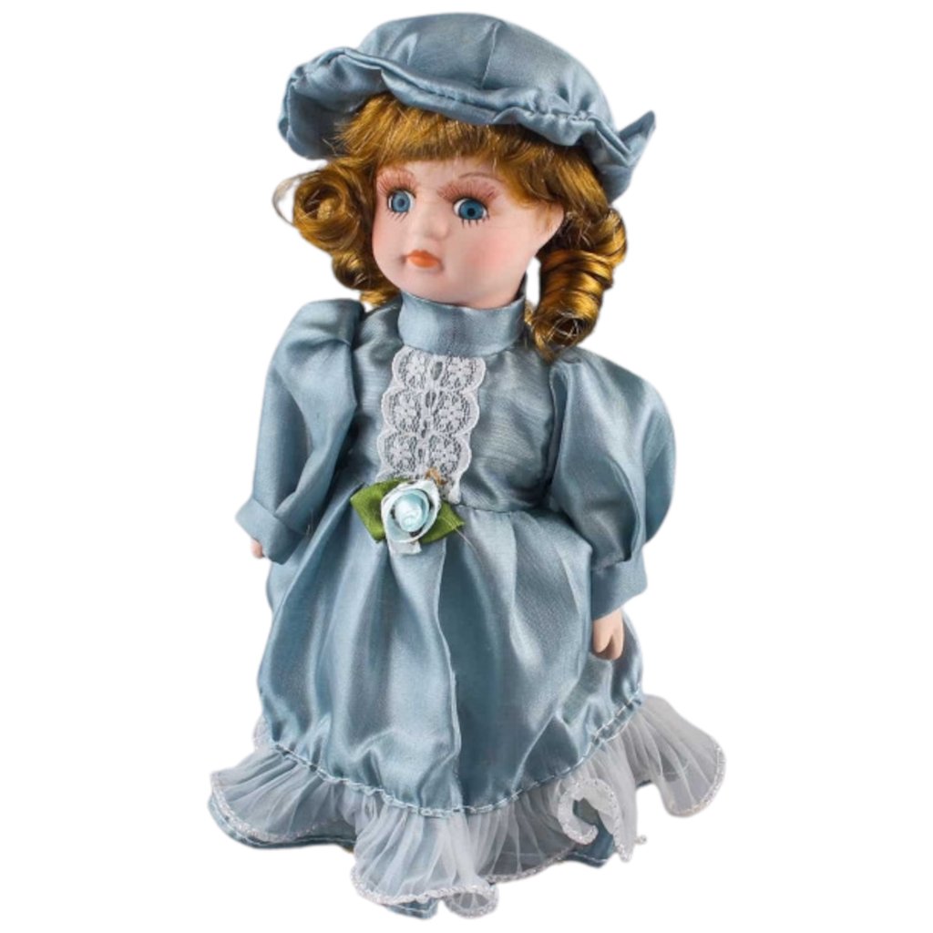 Okouzlující porcelánová panenka oblečena v bohatých šatech s modrým čepcem a mnoha detaily. Ruce a hlava jsou vyrobeny z krásně zpracovaného porcelánu.