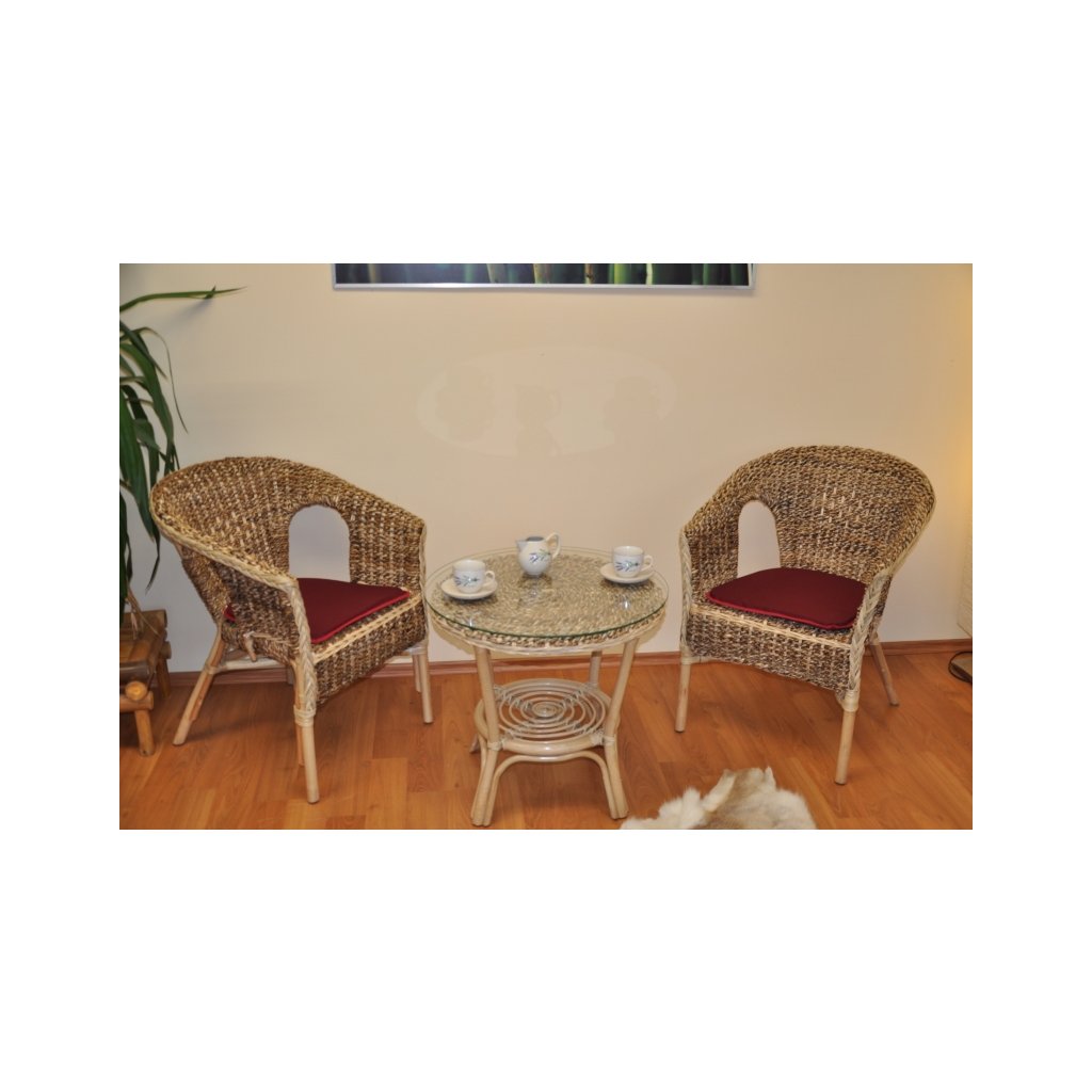Souprava obsahuje 2 křesla a stolek se sklem, kompletní sadu polstrů dle obrázku