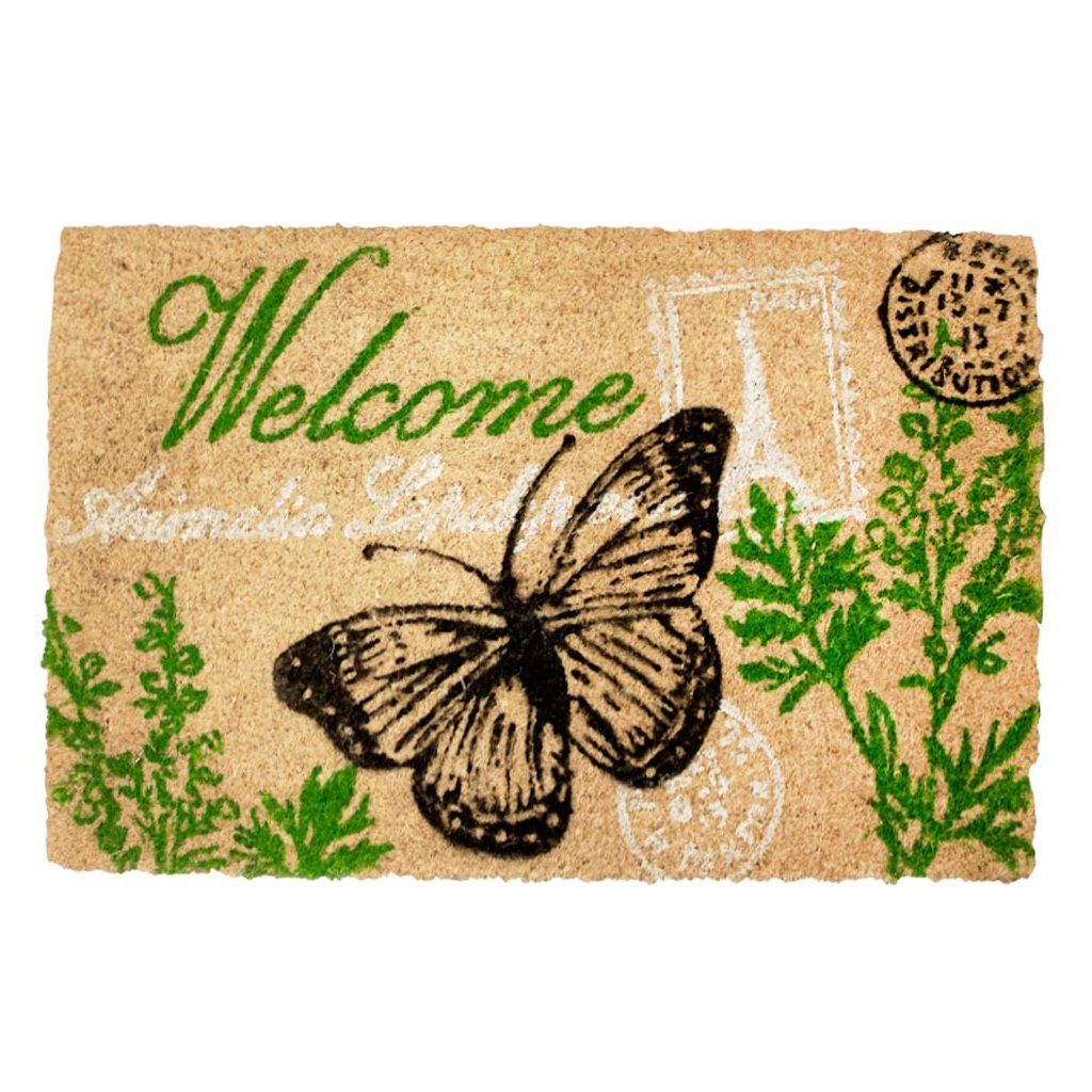 Rohožka z kokosu a gumy s nápisem WELCOME - VÍTEJTE a roztomilým motýlkem čistí podrážky každého příchozího a je tak vynikajícím pomocníkem proti špíně. Gumový podklad zaručuje nejlepší fixaci k podlaze.