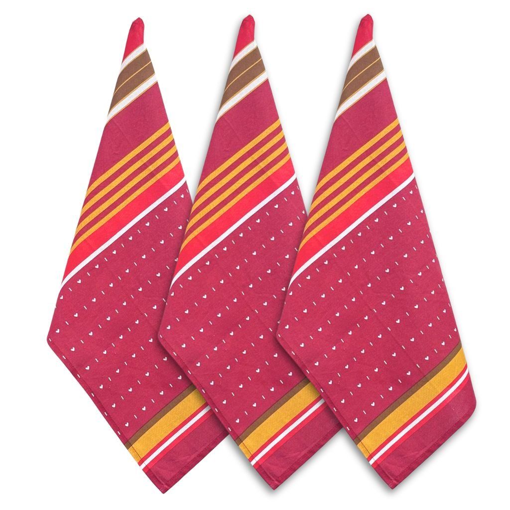 3 kusy bavlněných utěrek na červeném podkladě se zajímavým motivem srdíček a proužků. Kvalitní bavlněná utěrka slouží v kuchyni hlavně na utírání nádobí, příborů a sklenic, aby bylo vše suché a lesklé. Je to nepostradatelný praktický hezký doplněk, ideálně ladící s kuchyňským prostředím a dalším textilem. Potěší i jako dárek.