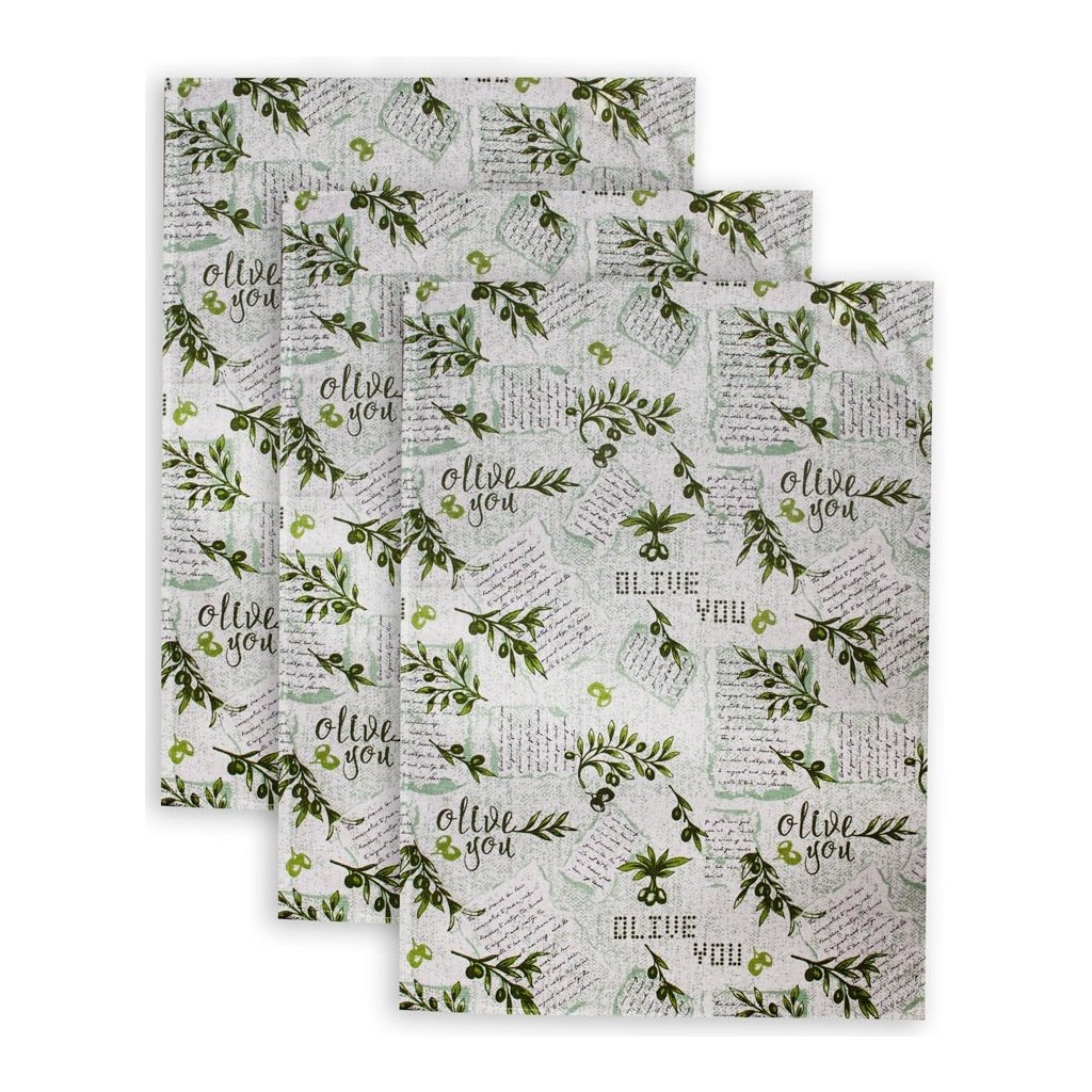 Sada 3 kusů utěrek s motivem oliv. Utěrky doporučujeme před prvním použitím vyprat, lépe pak plní svou funkci savost.