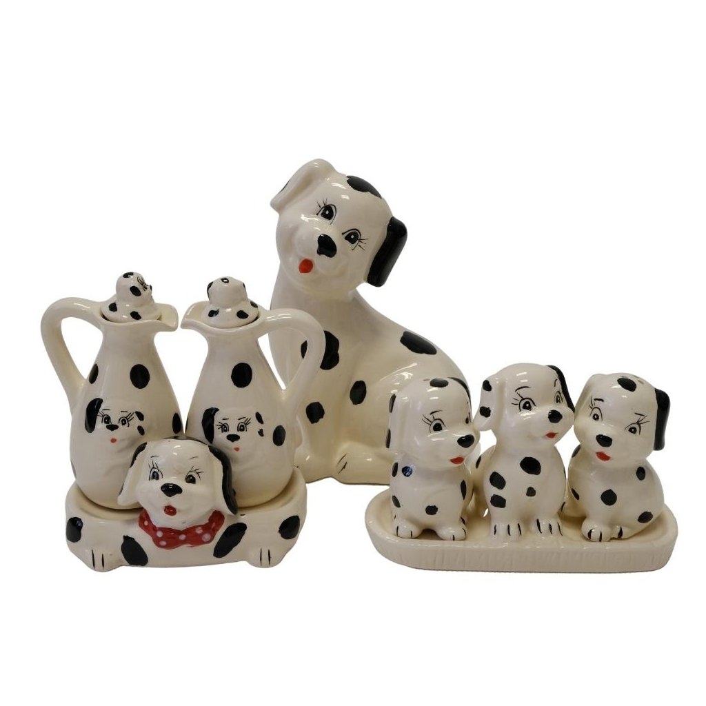 Krásná sada keramické solničky a pepřenky s motivem dalmatinů, třetí pejsek slouží jako držadlo.
