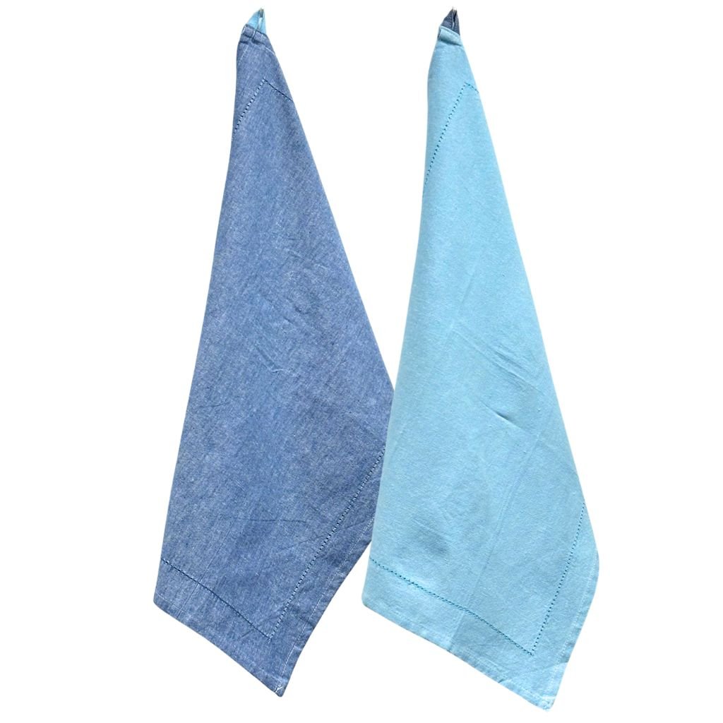 Sada 2 kusů modrých kuchyňských utěrek z recyklované bavlny. Výrobky z recyklované bavlny se těší rostoucí oblibě pro pozitivní vliv na životní prostředí. Materiál utěrky je měkký v přírodní barvě světle modré a tmavě modré. Pořiďte si k této utěrce další produkty z recyklované bavlny a slaďte tak kuchyň do jednoho stylu.